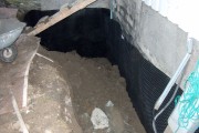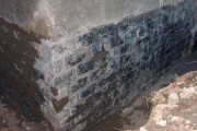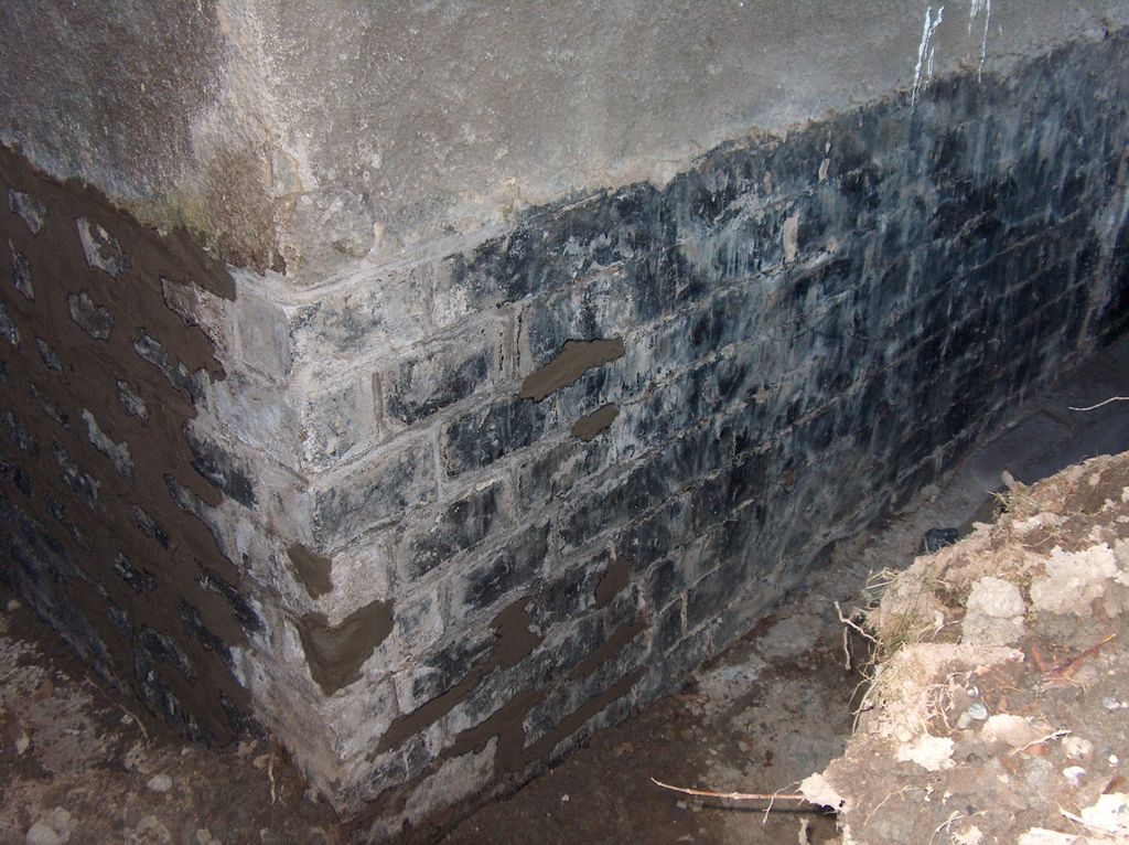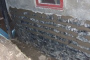 Etter å ha fått tettet sprekker i grunnmuren med mørtel, kunne arbeidet med å legge isopor-plater og grunnmursplast begynne. Selve arbeidet med å legge isopor og plast går forholdsvis raskt når en har kommet i gang, men tilbakefyllingen, som skjer for hånd, er et annet kapittel..