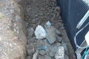 Til tilbakefyllings-masser fylles først en 20-30 cm med singel (type rund). Deretter et par lag med stein bortsett fra helt innerst ved plasten hvor det er singel for å unngå evt. hull pga. spisse steiner. Som jeg har skrevet tidligere, bruker jeg kun filtduk helt i bunn av grøfta under drensrøret for å sikre at massene ikke blandes. Men, over og på sidene av drensrøret, brukes kun singel og stein. Steinen legges for å holde jord og singel adskilt. Dette etter tips fra de som var her og grov, som fortalte at det ofte var problem med at filtduker tettet seg relavtivt raskt, slik at vannet ikke kom igjennom, og da må det graves opp på nytt. Øverst legges de massene som var der før, dvs. jord/leire. Steiner sorteres ut fra denne massen ved tilbakefylling for å få steinfri masse inn mot plasten pga risikoen for hull.