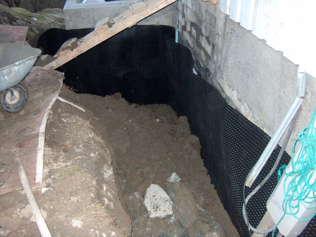 Første del av grunnmursplasten lagt. Stein, singel og jord som fyllmasser. Mot grunnmursplast kun singel og jord (steinfri)