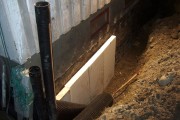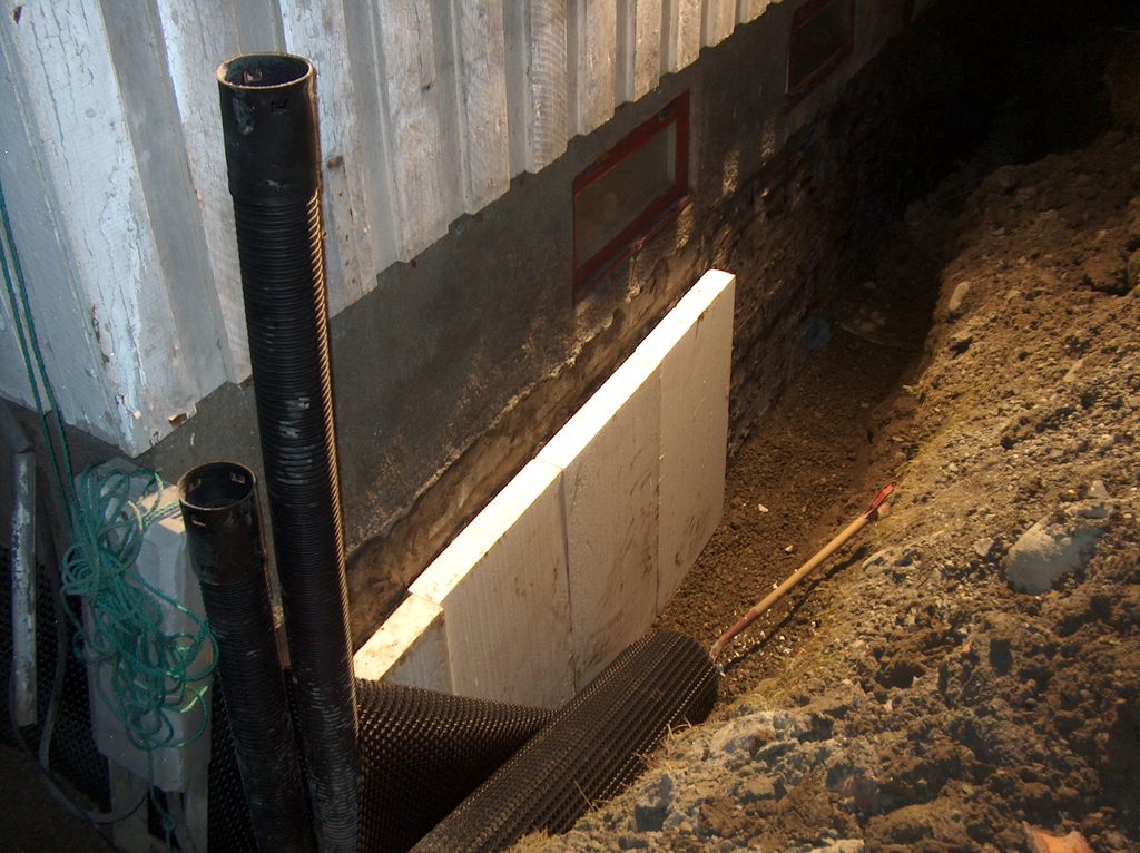 Innerst mot muren bruker jeg 10cm vanlig isopor (EPS). Disse er plassert mot toppen av grunnmurs-banketten, som stikker ca 10-15 cm ut fra grunnmuren. Før grunnmursplasten legges utenpå lager jeg en hulkil av singel nederst mot platene som plasten bøyes utover og mot midten av grøfta av. Dette gjør at vann som kommer sigende ned langs plasten transporteres bort fra muren og ca dit drensrøret ligger. P.g.a. denne bøyen, må en nødvendigvis splitte plasten nederst i hjørnene så langt som bøyen rekker opp på plasten.