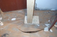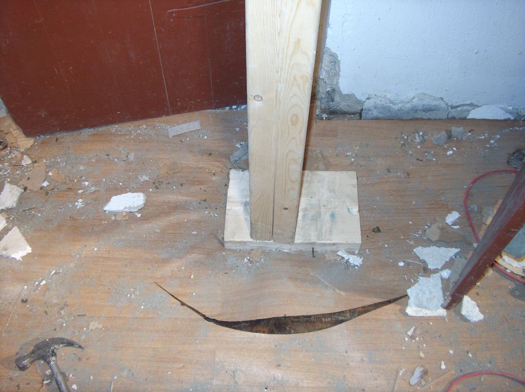 Selve jekkinga gikk greit, men det ble ganske mange ganger å flytte jekkene pga at jeg ikke hadde noen stålbjelke. 2″8″ ble litt for myke, men en avstand på ca 1m. (dvs annenhver gulvås) mellom jekkene fungerte fint. I tillegg hadde jeg bare 3 jekker tilgjengelig for dette. Det var også ett sted som ikke ville være med opp like mye som resten, og det var der hvor vannet og avløpet går, og derfor gadd (rettere sagt: hadde ikke lyst) jeg ikke å bruke uforholdsmessig mye kraft på det; det var allikevel kommet opp nok til at det ikke ble noe problem ift. resten. Ellers var det ikke så lett å få noe godt arrangement omkring trappehullet, heller ikke lett å få målt dette på noen god måte, så akkurat i det området ble det bare brukt skjønn og fornuft og ingen vater..