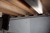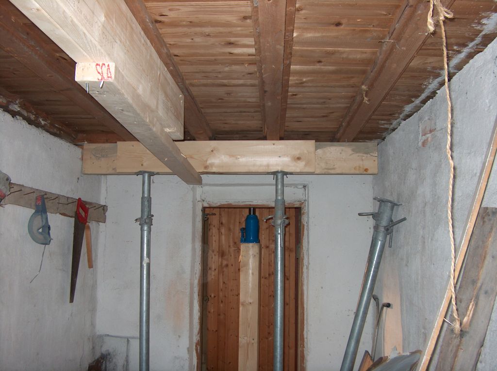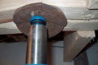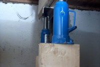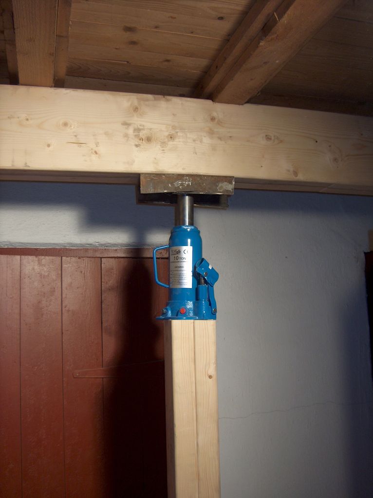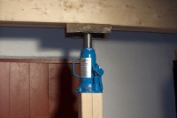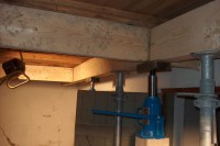 • Detalj fra jekkearrangementet. Her brukte jeg en 2"4" til avstivning sideveis på trebjelken