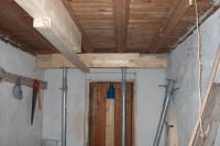 • Her er det ferdig jekket opp og lagt under med 2-toms plankeender. Her vises også at åsene er delt oppe på bæreveggen