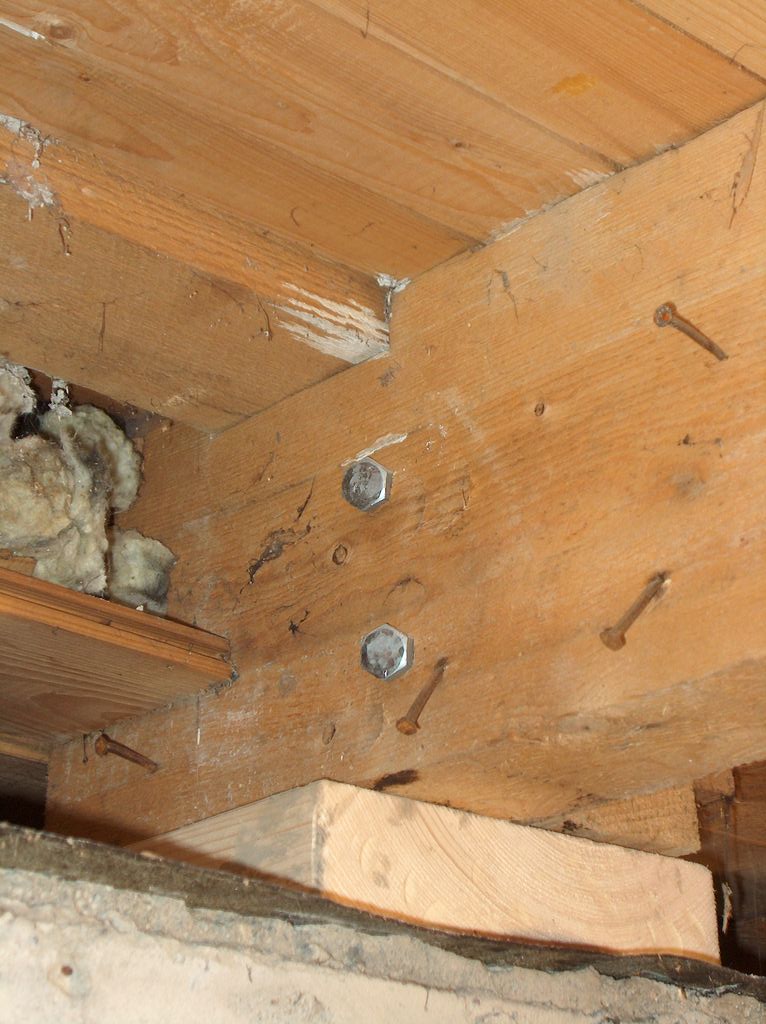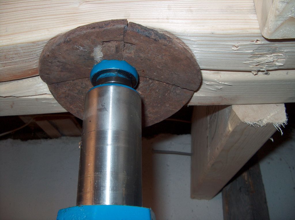 • Ett av jekkepunktene. La en u-profil i lengderetningen av trebjelkene for å fordele kraften fra jekken. Profilen var mer enn sterk nok, men den burde ikke vært noe særlig kortere