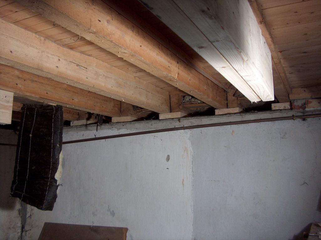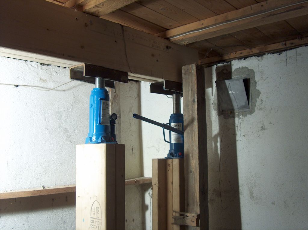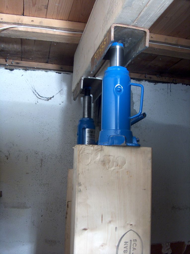 Så var det å rigge et nytt arrangement for jekking, dvs. doble 2″8″ på tvers av gulvåser med avstivere ut på sidene. 2″8″-ene la jeg så nært inntil bæreveggen som mulig på oppsida. Jeg hadde ikke flere stålbjelker tilgjengelig, så det ble å jekke direkte under 2″8″-ene. Som mellomlag mellom jekker og trebjelker, delte jeg en firkantbjelke i stål som jeg hadde liggende slik at jeg fikk u-profiler. Å jekke uten stål i mellom går selvfølgelig ikke, da jekkene bare vil trykkes inn i trebjelkene og det blir ikke kraft nok til å løfte huset.